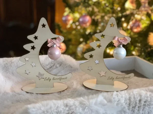 Houten kerstboompje met versiering